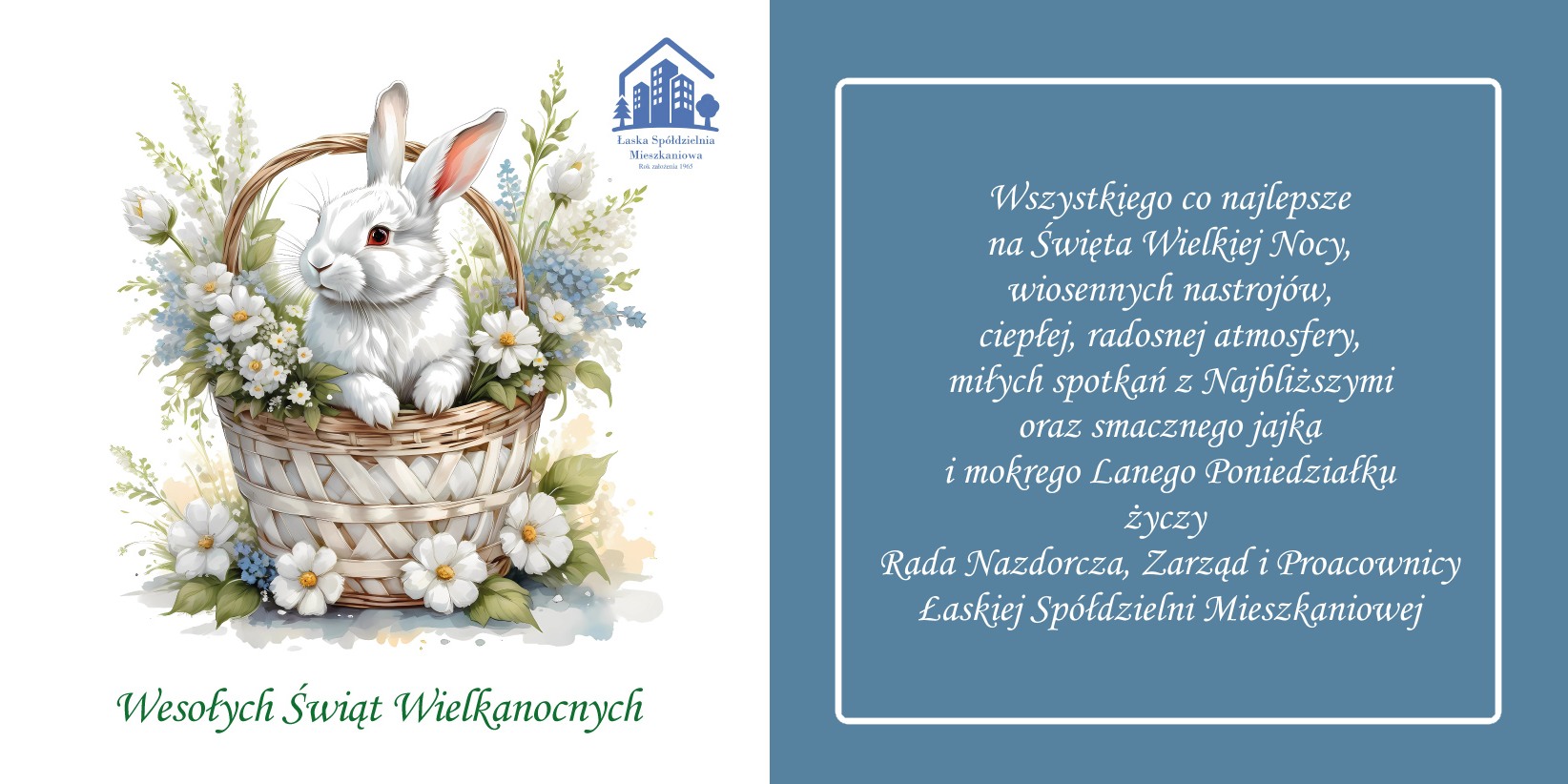 Wszystkiego co najlepsze na Święta Wielkiej Nocy, wiosennych nastrojów, ciepłej, radosnej atmosfery, miłych spotkań z Najbliższymi oraz smacznego jajka i mokrego Lanego Poniedziałku życzy Rada Nadzorcza, Zarząd i Pracownicy Łaskiej Spółdzielni Mieszkaniowej.